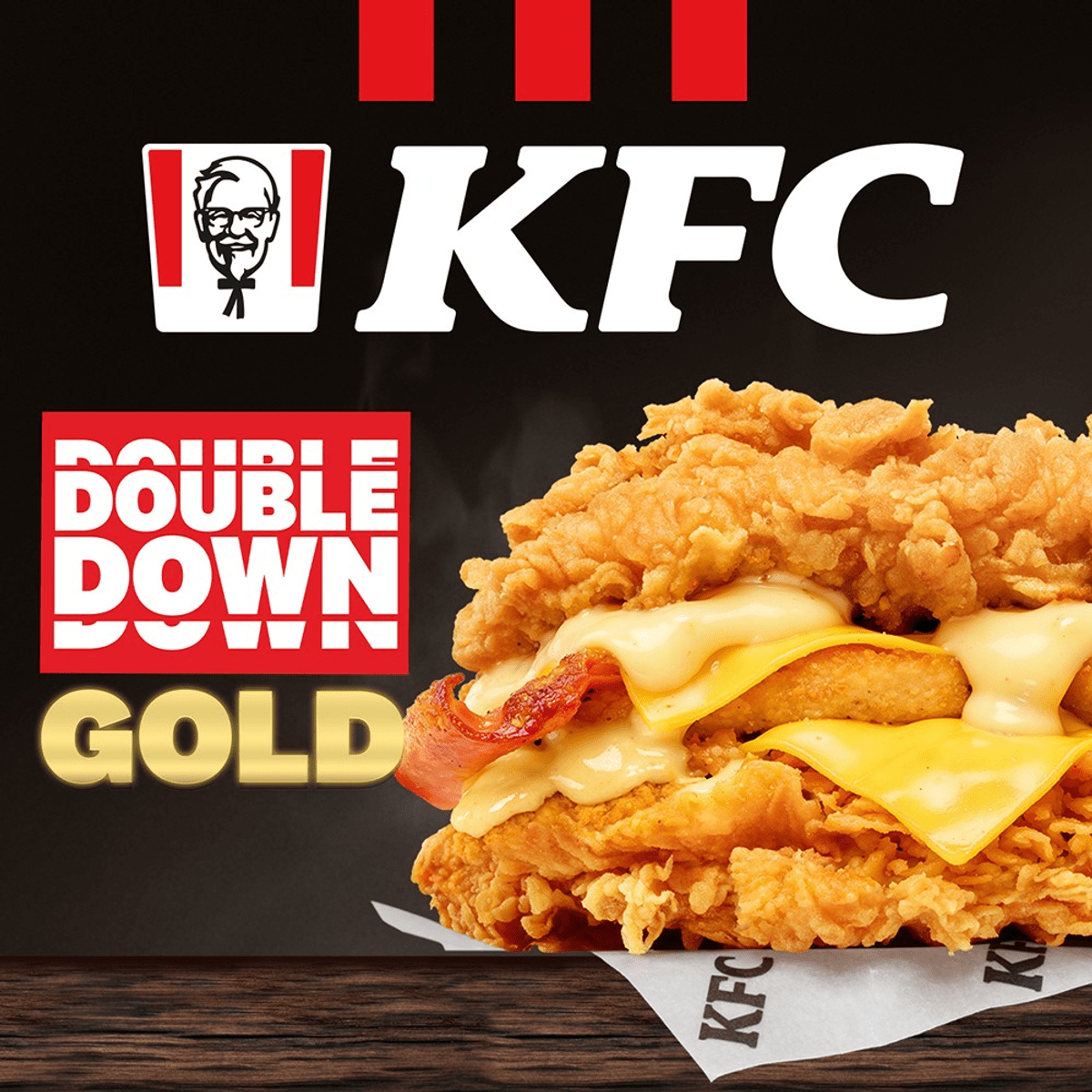 NOWOŚĆ! Teraz z Sosem Kentucky Gold. Dwa razy mocniej? Dwa razy więcej tego, co kochasz. Double Down. Starcie najmocniejszych zawodników. Dla naprawdę odważnych i naprawdę głodnych 🍗 🍗 🧀 🥓