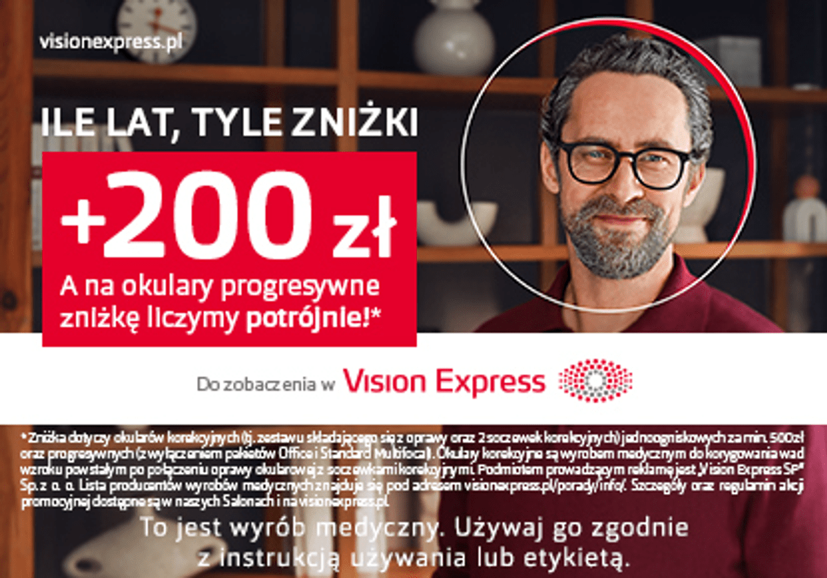 *Akcja promocyjna dotyczy dowolnych okularów korekcyjnych (tj. zestawu składającego się z oprawy oraz 2 soczewek korekcyjnych) jednoogniskowych za min. 500 zł oraz progresywnych (z wyłączeniem pakietów Office i Standard Multifocal). Okulary korekcyjne są wyrobem medycznym do korygowania wad wzroku powstałym po połączeniu oprawy okularowej z soczewkami korekcyjnymi. Podmiotem prowadzącym reklamę jest „Vision Express SP” Sp. z o. o. z siedzibą w Warszawie. Lista producentów wyrobów medycznych objętych akcją znajduje się pod adresem visionexpress.pl/porady/info. Szczegóły oraz regulamin akcji „Ile lat, tyle zniżki +200 zł” dostępne są w naszych Salonach oraz na visionexpress.pl.